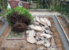 Сначала мы разбираем гранитный цоколь, разбиваем находящийся под ним бетон. В получившуюся траншею укладываем арматуру, по периметру участка возводим опалубку.