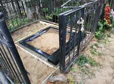 Достаточно простой заказ на изготовление и установку бюджетного памятника на четырёх покойных. Первым этапом работы является создание гранитного цоколя, образующего цветник, под которым, для надёжности, залито бетонное основание.